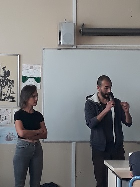 Hakim Djaziri s’est présenté en rappelant qu’il était déjà venu au lycée pour sa pièce Désaxé sur la radicalisation ; il s’est emparé cette fois de la thématique du féminicide en apprenant la victoire juridique d’Hager dans son combat pour faire condamner l’Etat dans le drame de sa sœur. Pour lui, le théâtre est « un vecteur de transmission extraordinaire et un accélérateur de prise de conscience » pour défendre une telle cause.