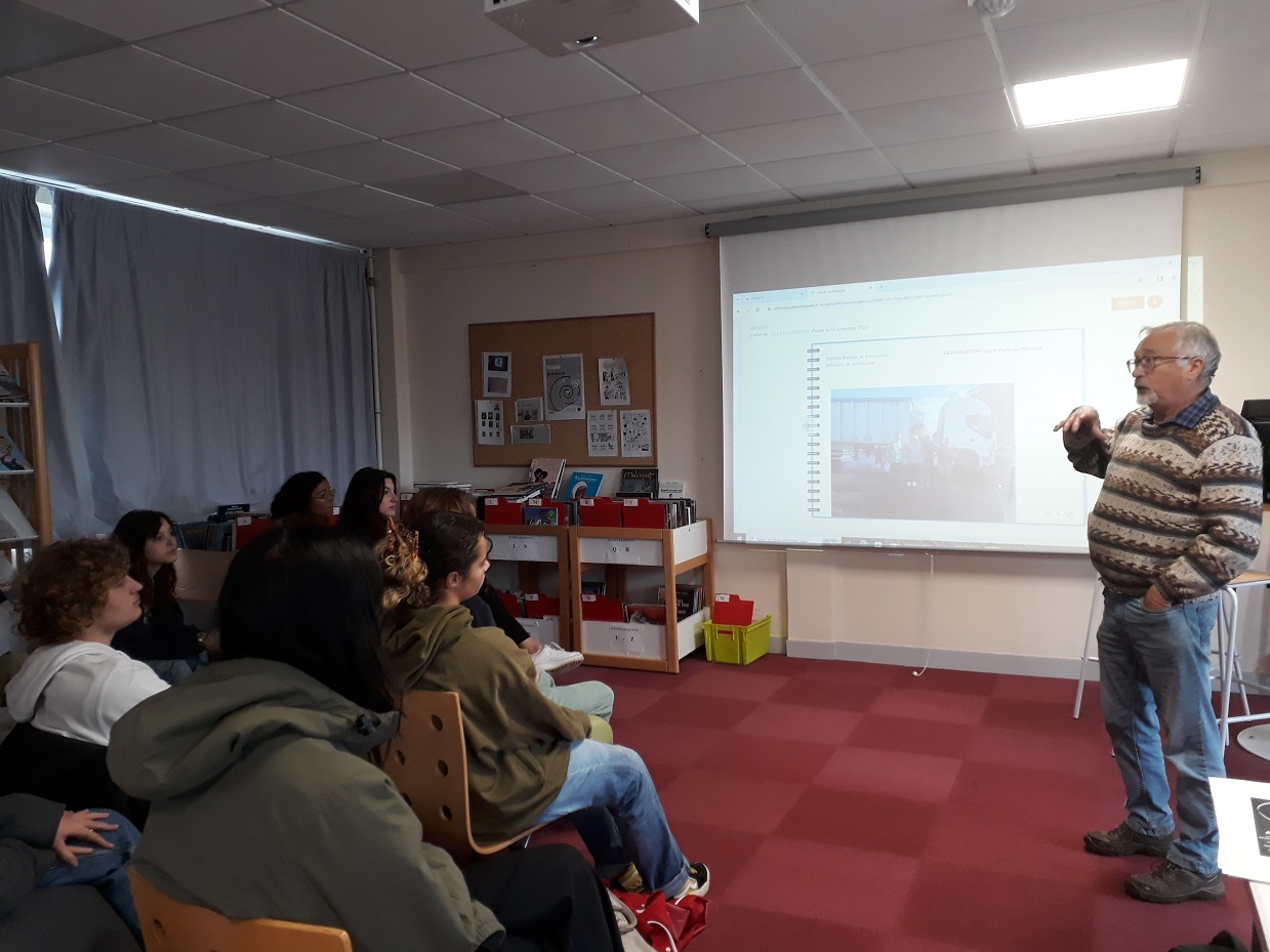 Pierre Basset a présenté l’association qui récolte des fonds et des produits pour aider les populations à Kharkiv et Odessa. Un transport par mois est organisé ; le dernier contenait du matériel médical donné par l’hôpital de Bayeux. Léna Beloussova a expliqué dans quelles conditions elle avait quitté Kharkiv, deux mois après le début de la guerre quand son immeuble a été bombardé. La rencontre s’est terminée avec la présentation d’un diaporama sur l’Ukraine et Odessa préparé par Tina Musinian, réfugiée ukrainienne scolarisée cette année au lycée.