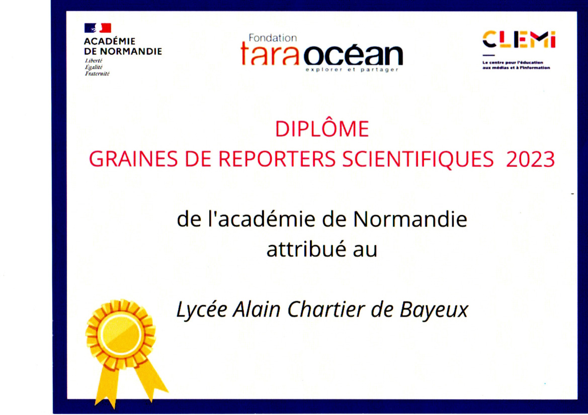La classe de Term 5 a été récompensée pour le travail fourni en enseignement scientifique dans le cadre du dispositif Graines de Reporters scientifiques. Les vidéos réalisées seront mises en ligne sur le site de la Fondation Tara.