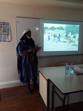 L'intervention a porté sur la géographie et le mode de vie de cette région isolée (une route a été construite il y a seulement quelques années et un point d’eau a été aménagé dans une école cette année) ainsi que sur la langue (la langue des Touaregs est le tamachek avec son alphabet le tifinar). Mais c’est surtout la scolarisation des élèves que soutient l’ATSN et Tana lui-même s’efforce de favoriser la scolarisation des filles en accord avec la politique du Président de la République qui veut développer la construction d’internats pour les élèves.