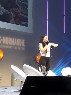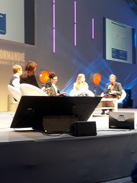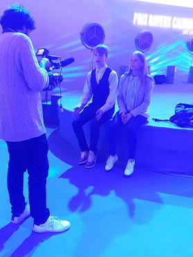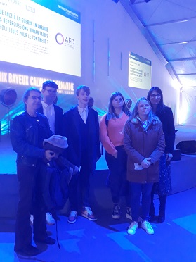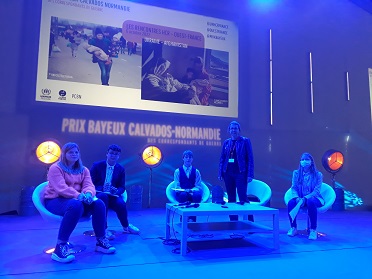 Dans le cadre du Prix Bayeux Calvados-Normandie des correspondants de guerre, la classe de 2nd 1 a participé à la rencontre HCR-Ouest-France. Quatre élèves étaient sur le plateau pour interviewer les deux réfugiées invitées. Ils posent avec Alexandra Turcat, journaliste à Ouest-France qui animait le débat et Céline Schmitt, porte-parole du HCR.