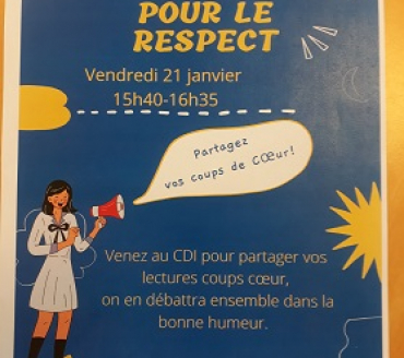 A l'occasion des Nuits de la Lecture qui vont se dérouler du 20 au 23 janvier, les élèves du Groupe de Parole du lycée ont souhaité proposer une activité autour des livres. Vendredi 21 janvier après-midi, tous les volontaires sont les bienvenus pour débattre de leurs lectures coups de cœur au CDI.